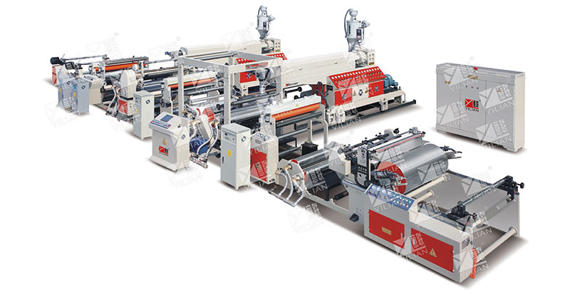 SJFM型双主机挤出淋膜复合机组,吸收国外先进技术,是目前国内一次完成双面淋膜工艺的先进机种,设备用于需要一次生产完成的双面涂塑纸,或多层的如牛奶盒、果汁盒、饮料盒等复合材料,是生产无菌包装材料的理想设备